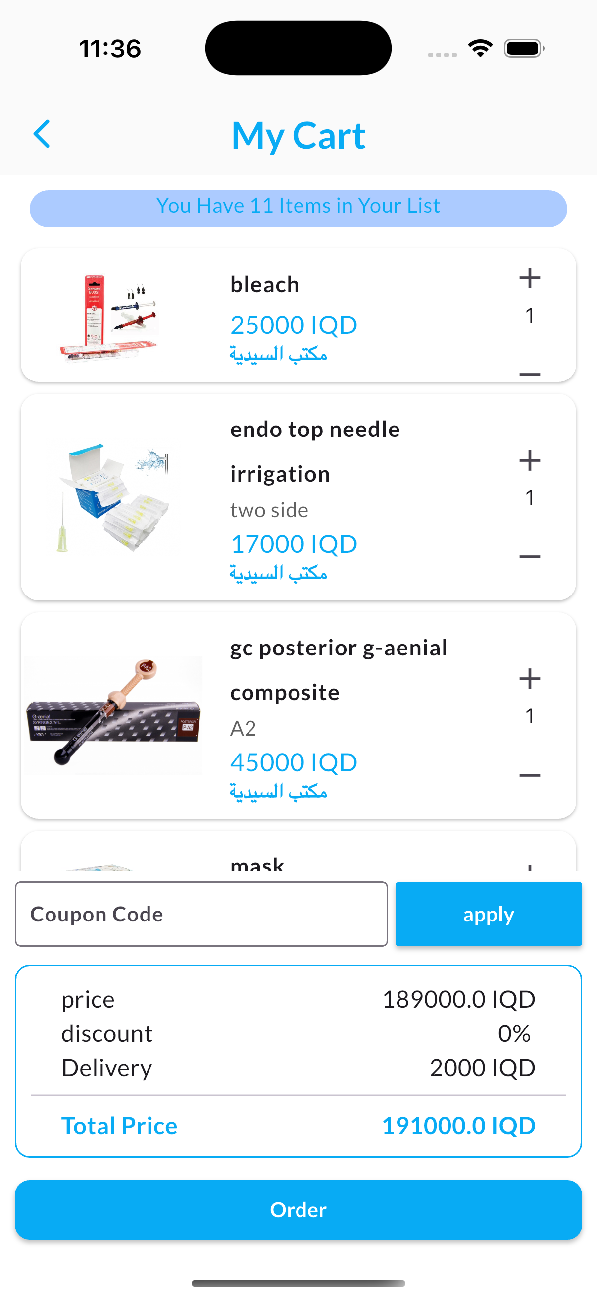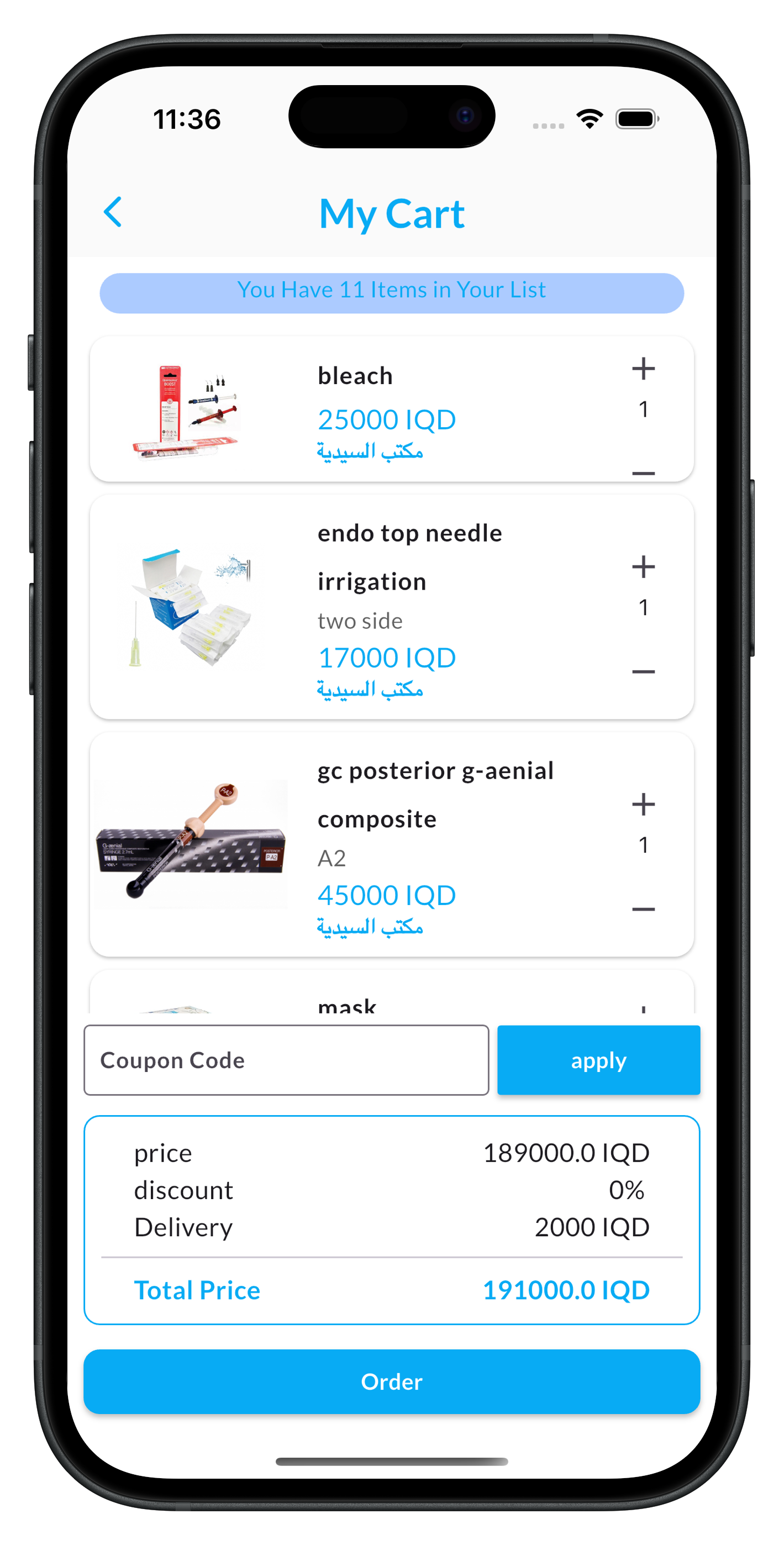 Add products to your cart, apply coupon codes, and confirm the order within seconds. Designed to be fast and intuitive for busy dental clinics.
